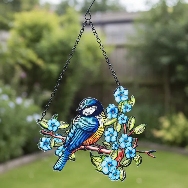 Made from cut glass, the vibrant blue tit design catches the sunlight and sparkles throughout the day. A striking and uplifting decoration that looks lovely hanging in a window, on a pergola, or in your garden.