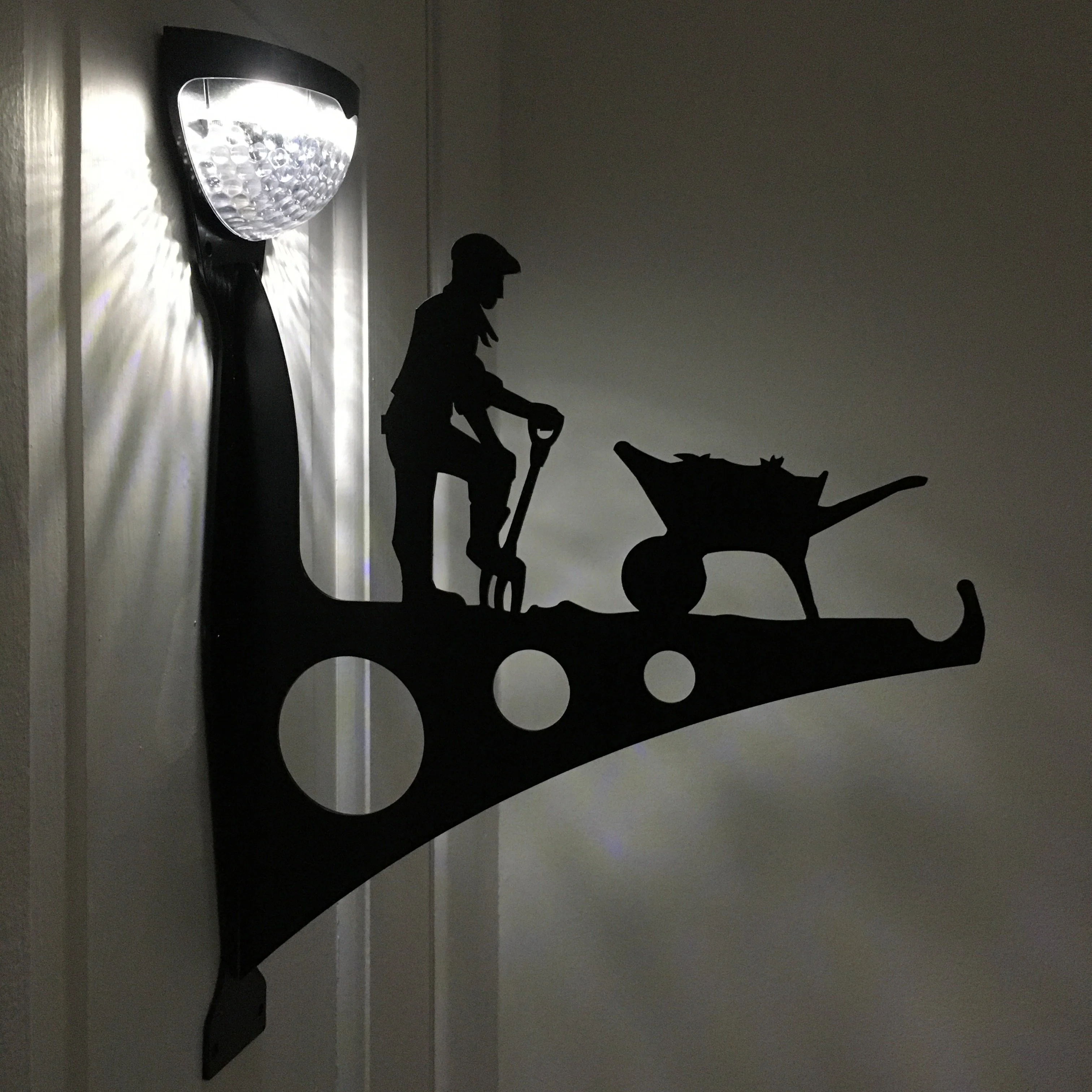 A bespoke steel bracket of aĀ man doing his gardening. The bracket also includes a powerful solar-powered LED light - a perfect addition to light up the garden.Ā