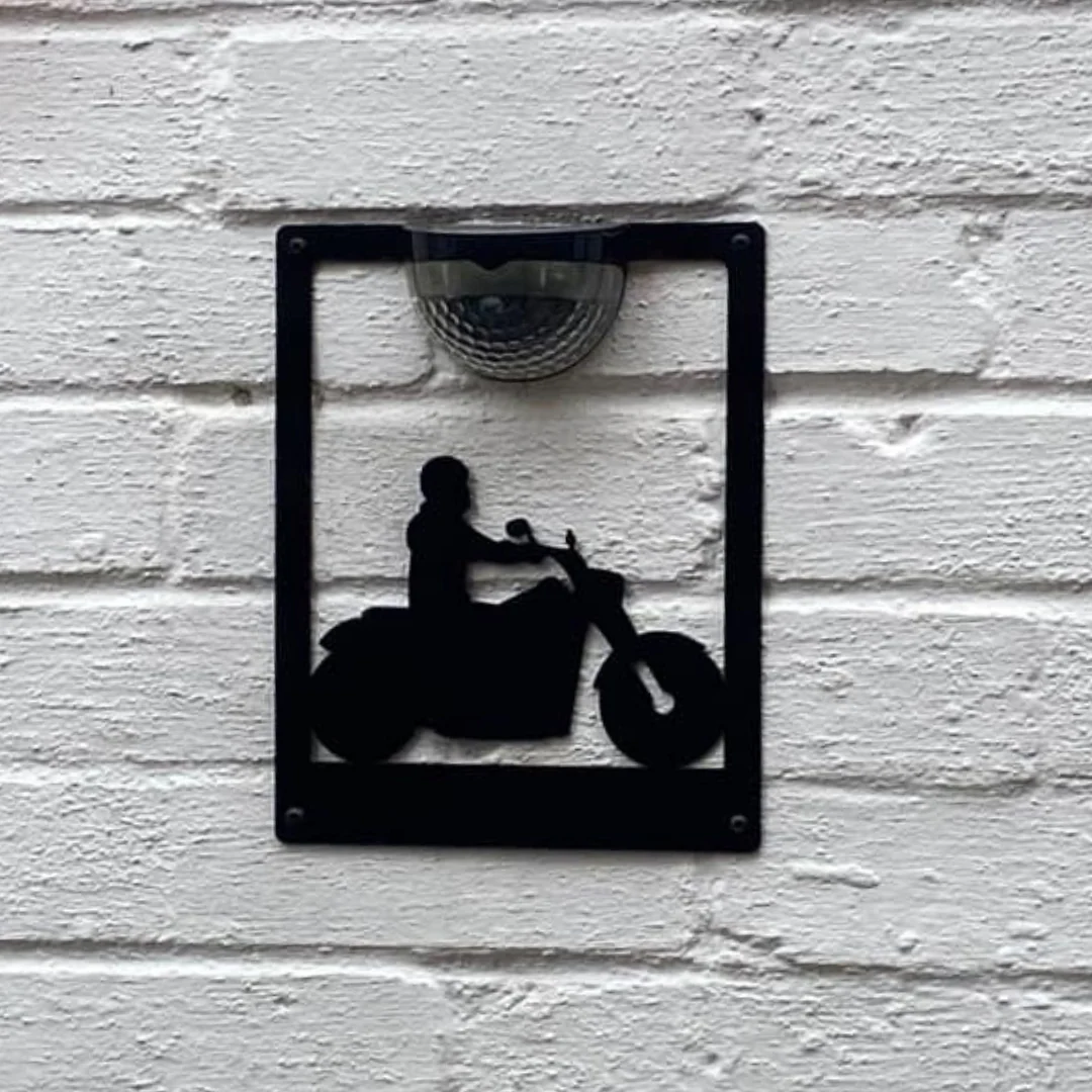Our bespoke solar light of a man on his motorbike is a great way to add character to your garden.