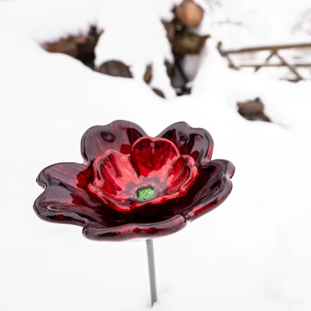 The Recycled Aluminum Poppy (small or large) with a 30cm stake rod is great for displaying outdoors and will add colour to your garden š¹