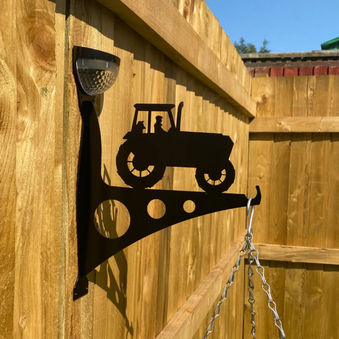 A bespoke steel bracket of aĀ man and his dog in their tractor. The bracket also includes a powerful solar-powered LED light - a perfect addition to light up the garden.