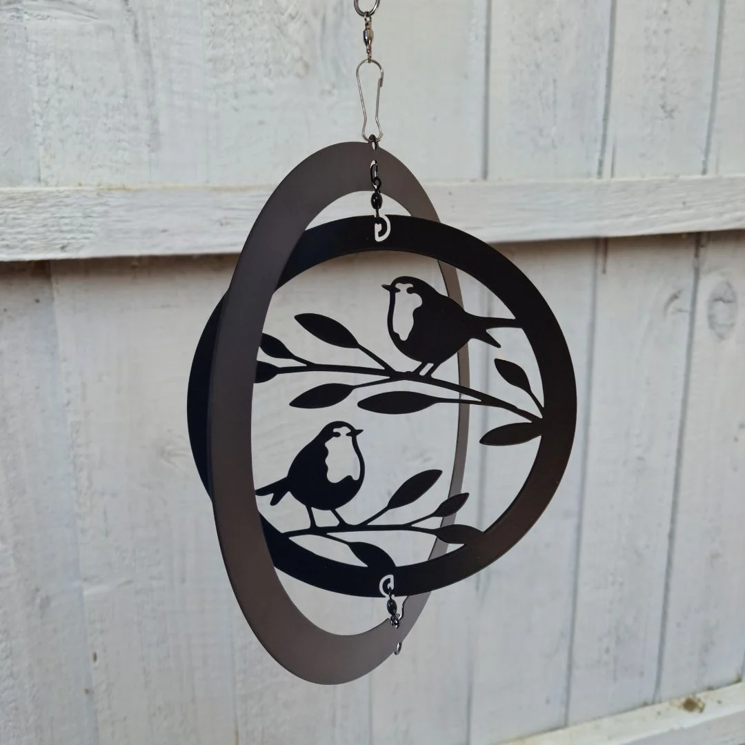 This matte black set of 2 Robins in Leaves Hanging Silhouette Orbit Wind Spinner is perfect for anyone who loves robins. The intricate design and gentle spin create a stunning feature for your garden, adding a unique and elegant touch to your outdoor space.